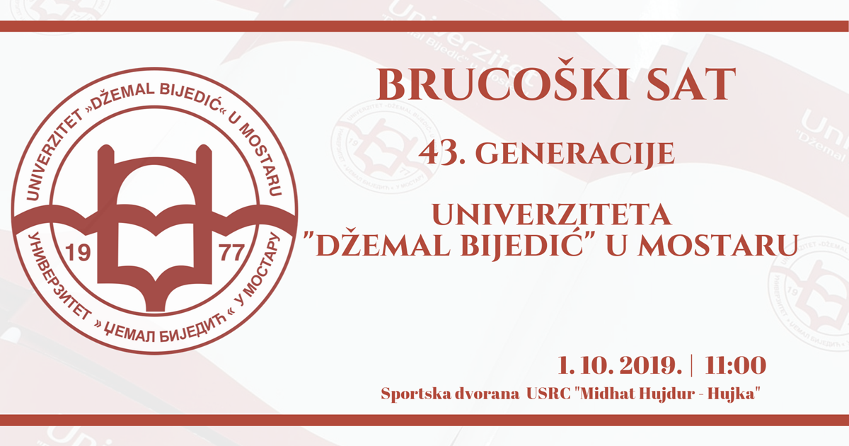 Obavještavamo vas da će se manifestacija "Brucoški sat" održati u utorak 01.10.2019. godine, za sve studente upisane u prvu godinu studija u akademskoj 2019/2020. godini sa početkom u 11:00 sati, u Sportskoj dvorani „Midthat Hujdur-Hujka" u Kampusu Univerziteta „Džemal Bijedić" u Mostaru.