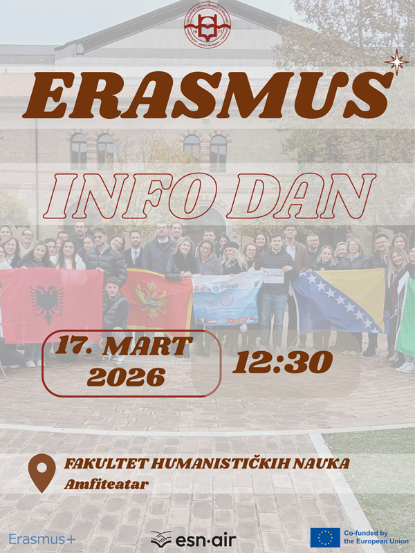 U utorak, 17.03.2026. Kancelarija za međunarodnu saradnju u amfiteatru Fakulteta humanističkih nauka organizuje Erasmus info dan od 12:30 do 13:30.